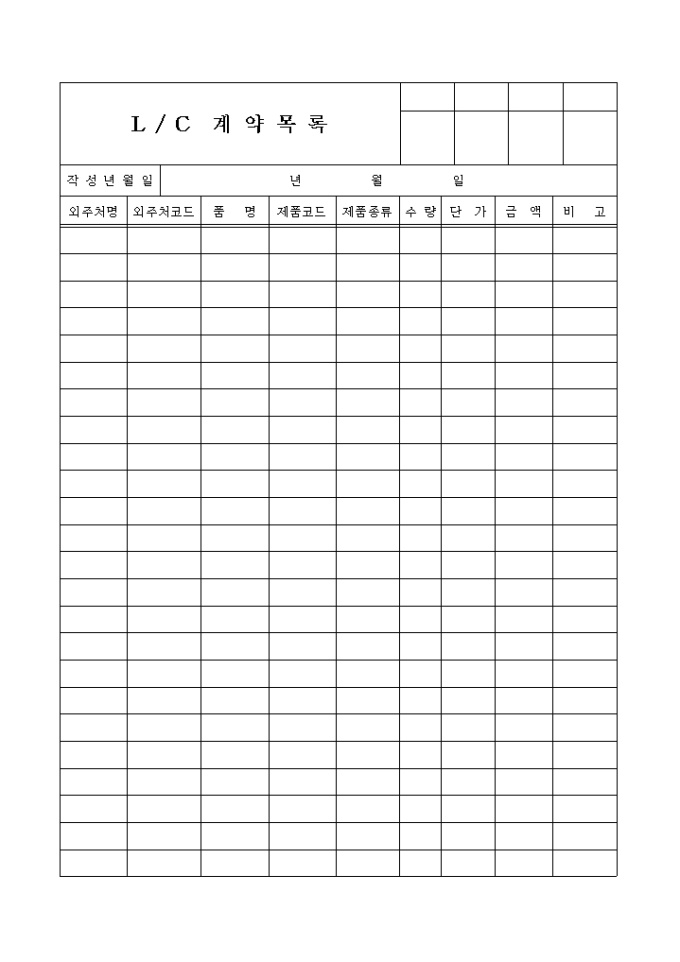 9,000원/월외주처명, 외주처코드, 품명, 제품코드, 종류, 수량, 단가, 금액을 기록하는 LC계약목록 양식입니다.