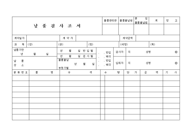 9,000원/월납품검사조서 양식입니다. 납품 물품의 수량, 단가, 금액등을 검사하실때 사용하는 양식입니다.