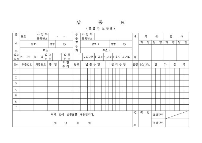 납품목에 관한 상세정보를 공급자가 보관할때 쓰이는 양식입니다.