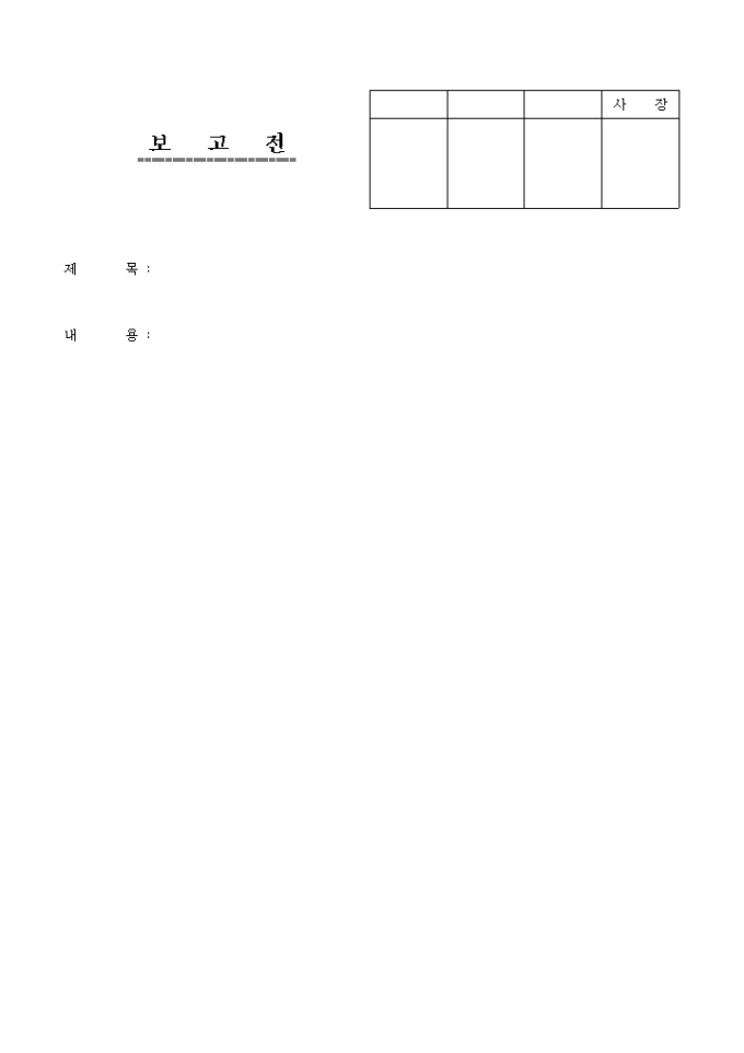보고전 양식 입니다. 제목과 내용으로 구성되어 있으며 내용은 육하원칙에 따라 기술하시면 됩니다. 업무보고등 다양한 분야의 보고서양식으로 사용하실 수 있습니다.