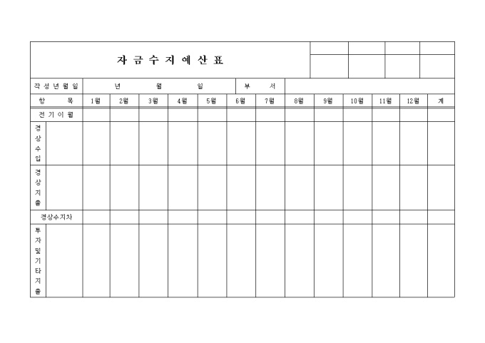 자금수지예산표 양식입니다. 월별 경상수입, 경상지출, 투자 및 기타지출로 구분하여 작성하는 예산표 양식입니다.