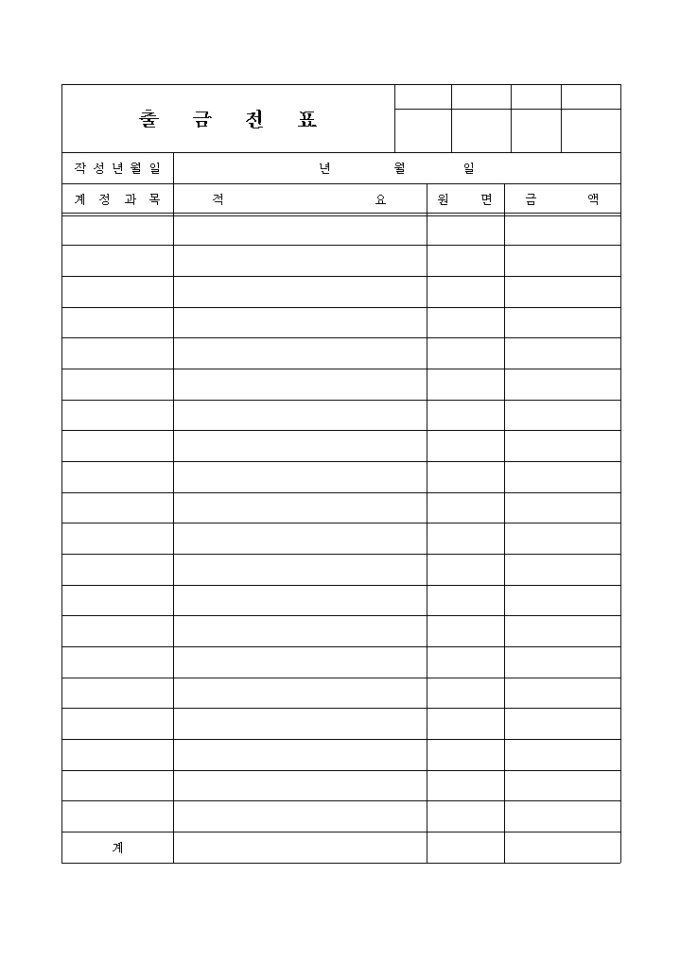 출금전표1(전면) 양식입니다. 계정과목, 적요, 금액으로 구성되 양식입니다.