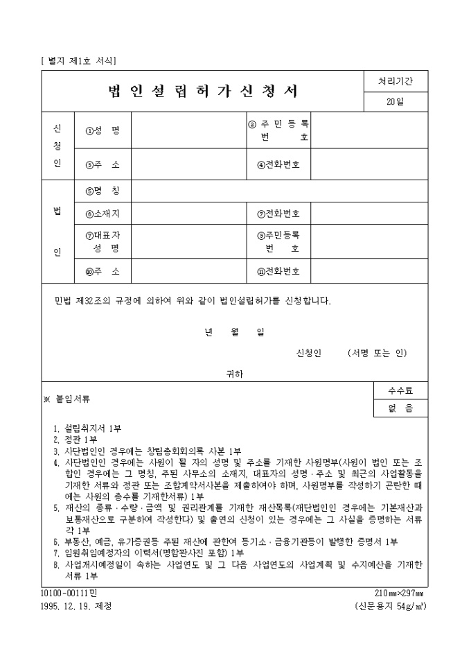 법인 설립 허가신청서 양식 예제입니다. 민법 제32조의 규정에 의하여 위와 같이 법인설립허가를 신청합니다. 년 월 일 신청인 (서명 또는 인) 귀하
