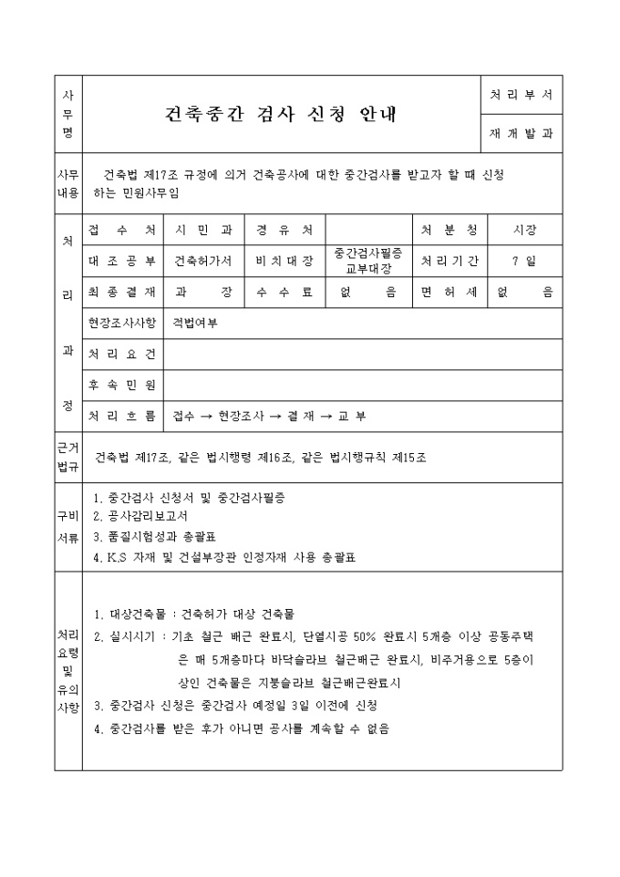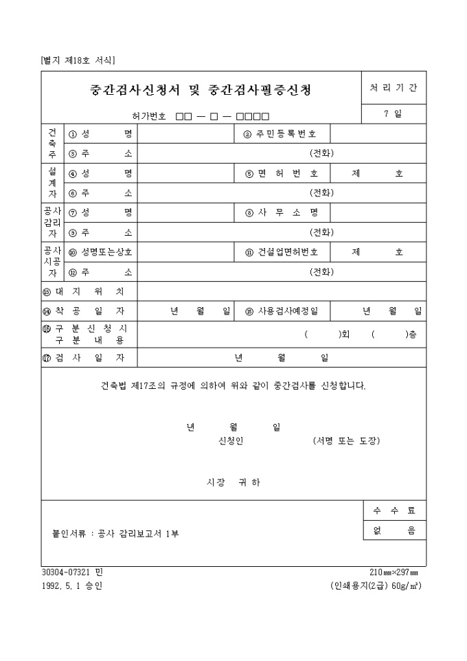9,000원/월건축법 제17조의 규정에 의하여 위와 같이 중간검사를 신청할 때 사용하는 "중간 검사신청서 및 중간검사 필증신청" 양식입니다.