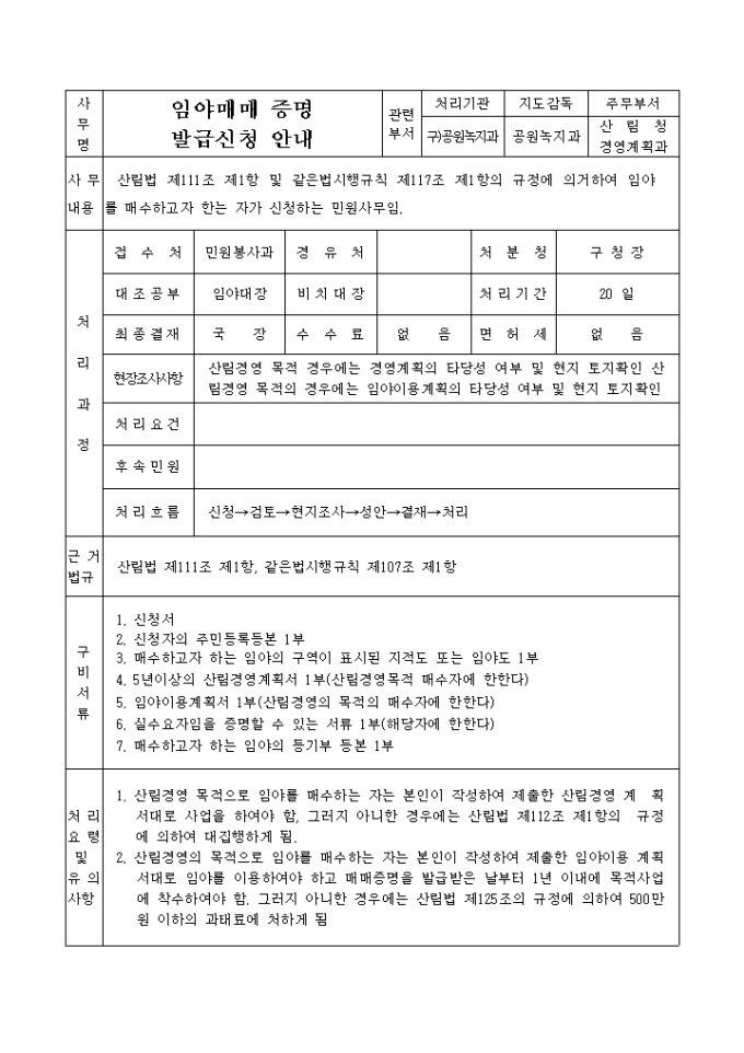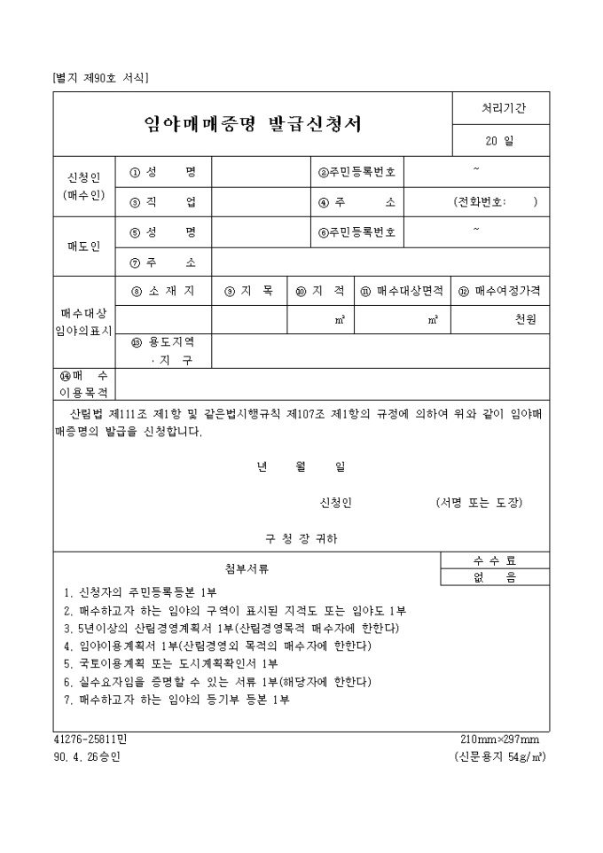 산림법 제111조 제1항 및 같은법시행규칙 제107조 제1항의 규정에 의하여 위와 같이 임야매매증명의 발급을 신청할 때 사용하는 임야매매 증명 발급신청서 양식입니다.
