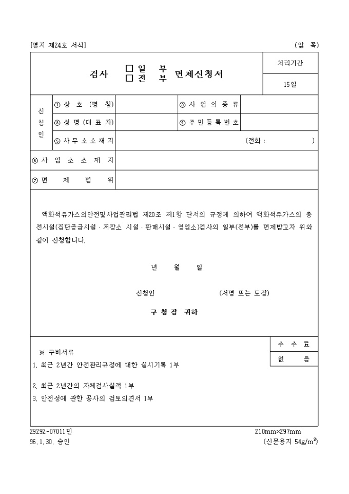 액화석유가스의안전및사업관리법 제20조 제1항 단서의 규정에 의하여 액화석유가스의 충전시설(집단공급시설․저장소 시설․판매시설․영업소)검사의 일부(전부)를 면제받고자 위와 같이 신청할 때 사용하는 "검사(일부,전부)면제신청서" 양식입니다.
