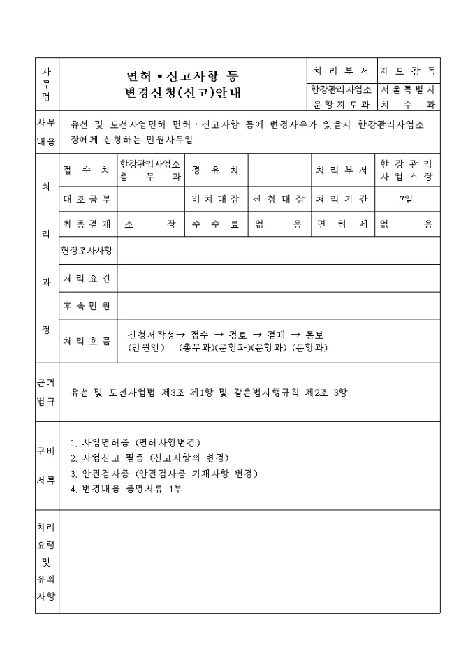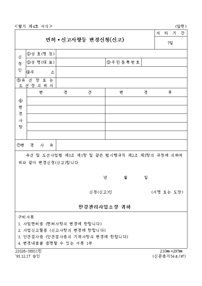 유선 및 도선사업법 제3조 제1항 및 같은 법시행규칙 제2조 제3항의 규정에 의하여 위와 같이 변경신청(신고)할 때 사용하는 "면허 신고사항등 변경신청(신고)" 양식입니다.