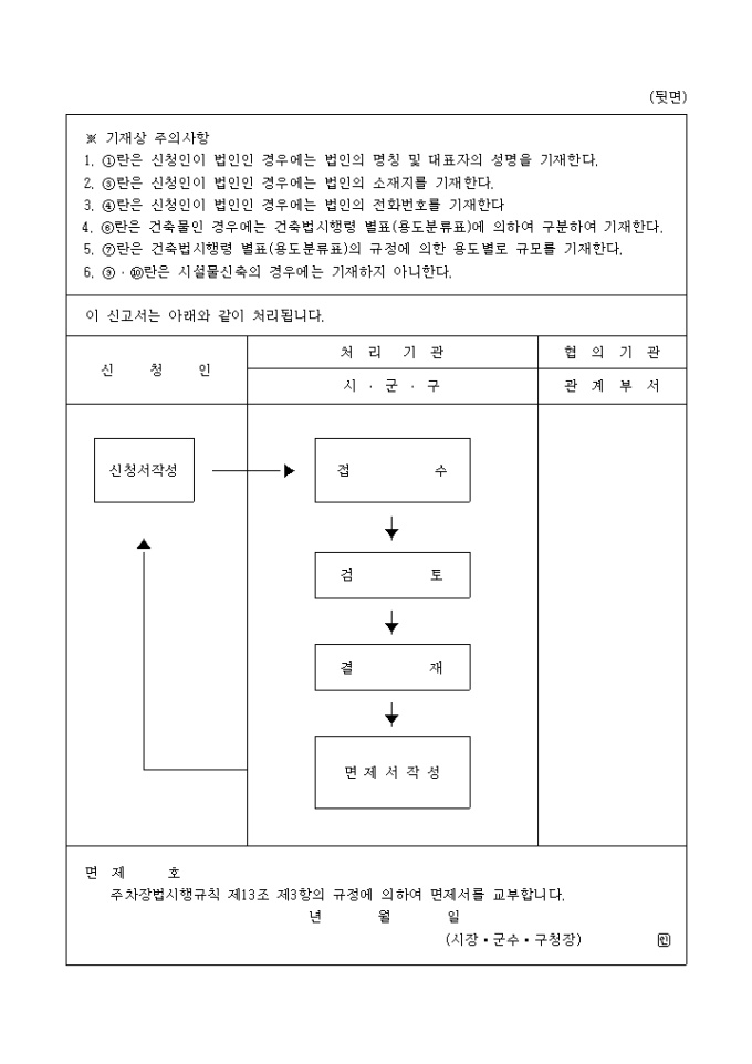 주차장법 제19조 제5항 및 동법시행령 제8조 제2항의 규정에 의하여 부설주차장설치의무를 면제받고자 부설주차장의 설치에 필요한 비용을 첨부하여 이에 신청할 때 사용하는 "부설 주차장 설치 의무면제 신청서 및 면제서" 양식입니다.