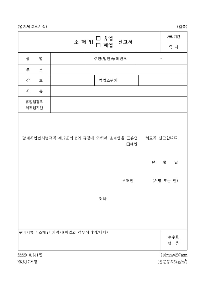 구비서류 : 소매인 지정서(폐업의 경우에 한합니다)