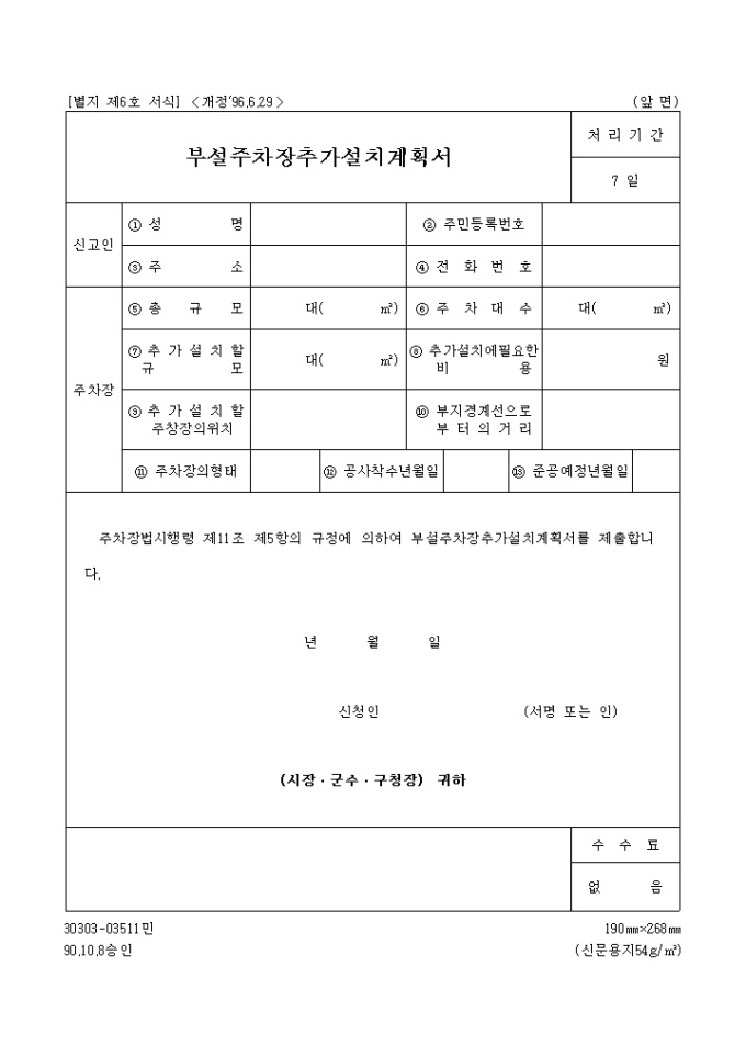 부설주차장 추가 설치 계획서(별지 제6호)(96.6.29개정)