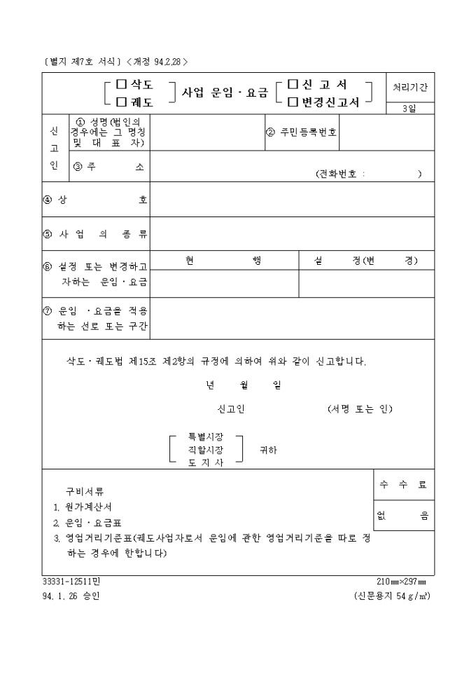 삭도ㆍ궤도법 제15조 제2항의 규정에 의하여 위와 같이 신고할 때 사용하는 "삭,궤도 사업 운임 요금신고" 양식입니다.