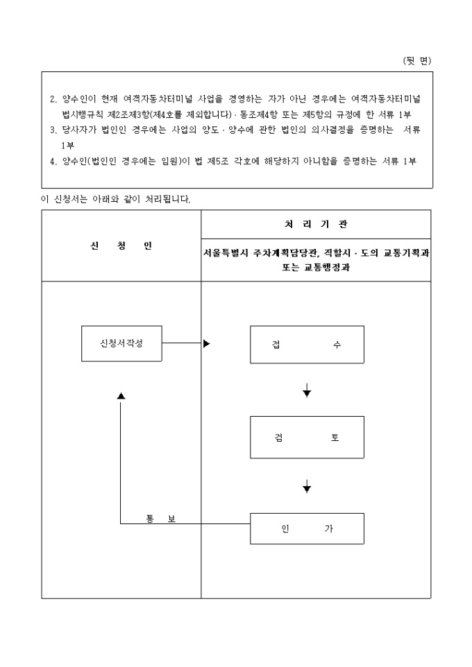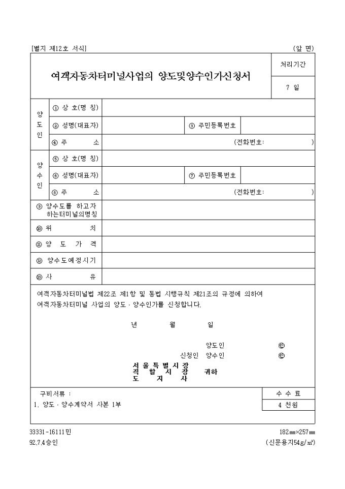 9,000원/월여객자동차터미널법 제22조 제1항 및 동법 시행규칙 제21조의 규정에 의하여 여객자동차터미널 사업의 양도ㆍ양수인가를 신청할 때 사용하는 "여객 자동차 터미널 사업의 양도 및 양수인가신청서" 양식입니다.