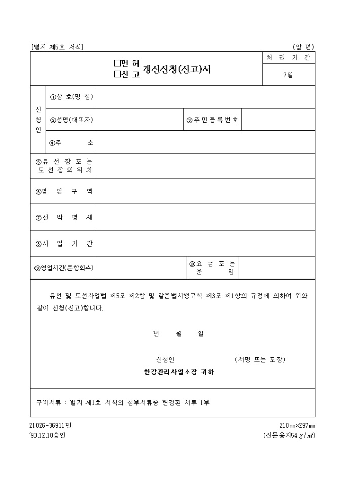 9,000원/월유선 및 도선사업법 제5조 제2항 및 같은법시행규칙 제3조 제1항의 규정에 의하여 위와 같이 신청(신고)할 때 사용하는 "유선 및 도선사업 면허,신고 갱신 신청(신고)서" 양식입니다.