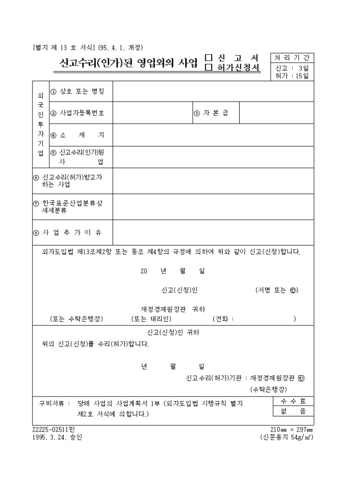 신고 수리된 영업외의 사업(신고서,허가신청서) 양식 예제입니다.