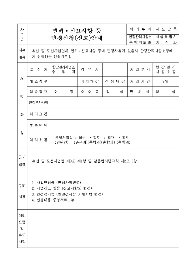 9,000원/월유선 및 도선사업법 제3조 제1항 및 같은법시행규칙 제2조 제3항의 규정에 의하여 위와 같이 변경신청(신고)할 때 사용하는 "유선 및 도선사업 면허,신고사항 변경신청서" 양식입니다.