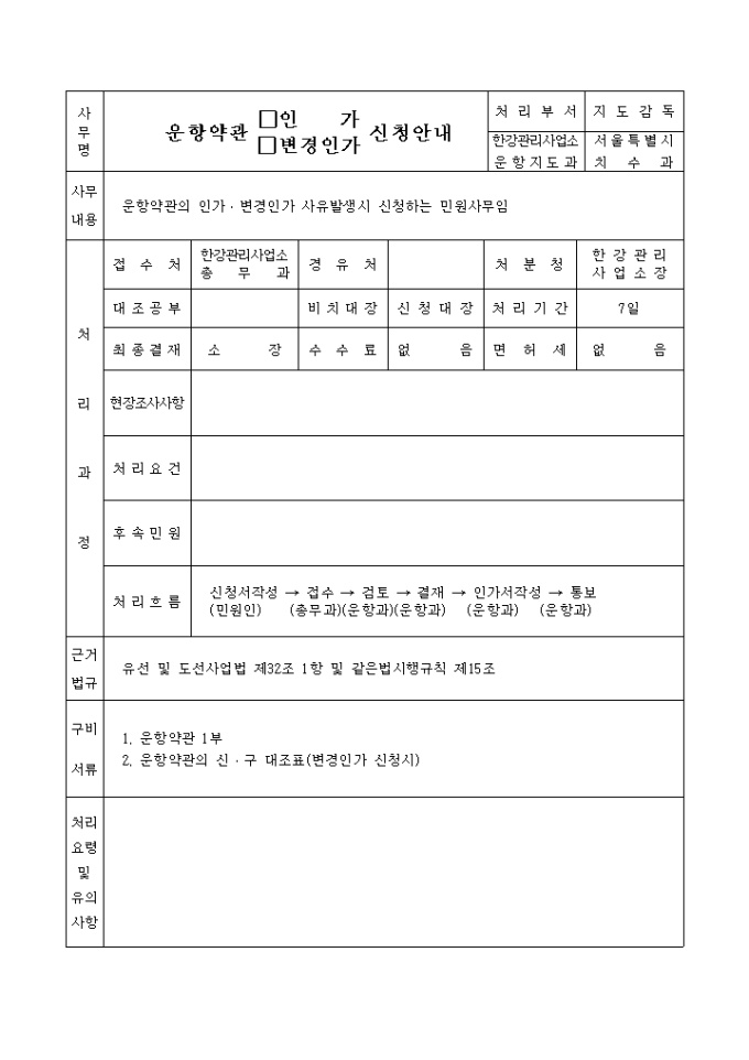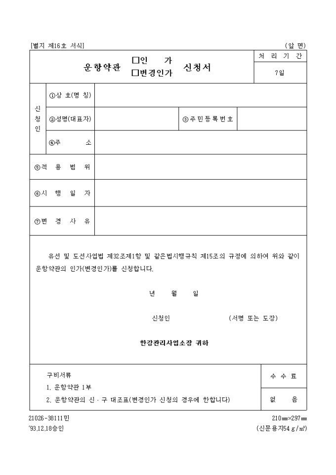 9,000원/월유선 및 도선사업법 제32조제1항 및 같은법시행규칙 제15조의 규정에 의하여 위와 같이 운항약관의 인가(변경인가)를 신청할 때 사용하는 "유선 및 도선사업 운항약관 인가(변경인가)신청서" 양식입니다.