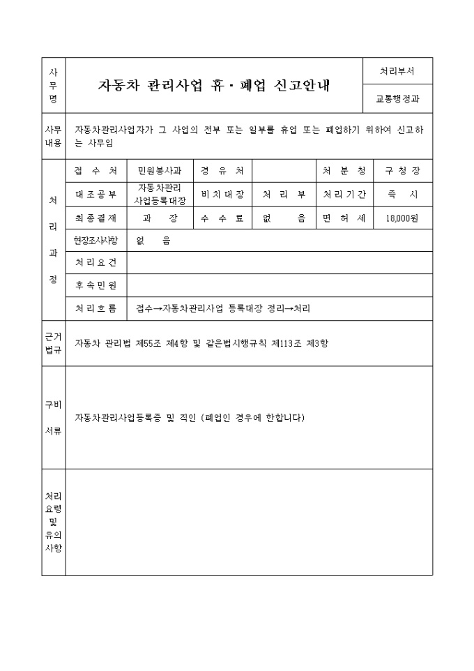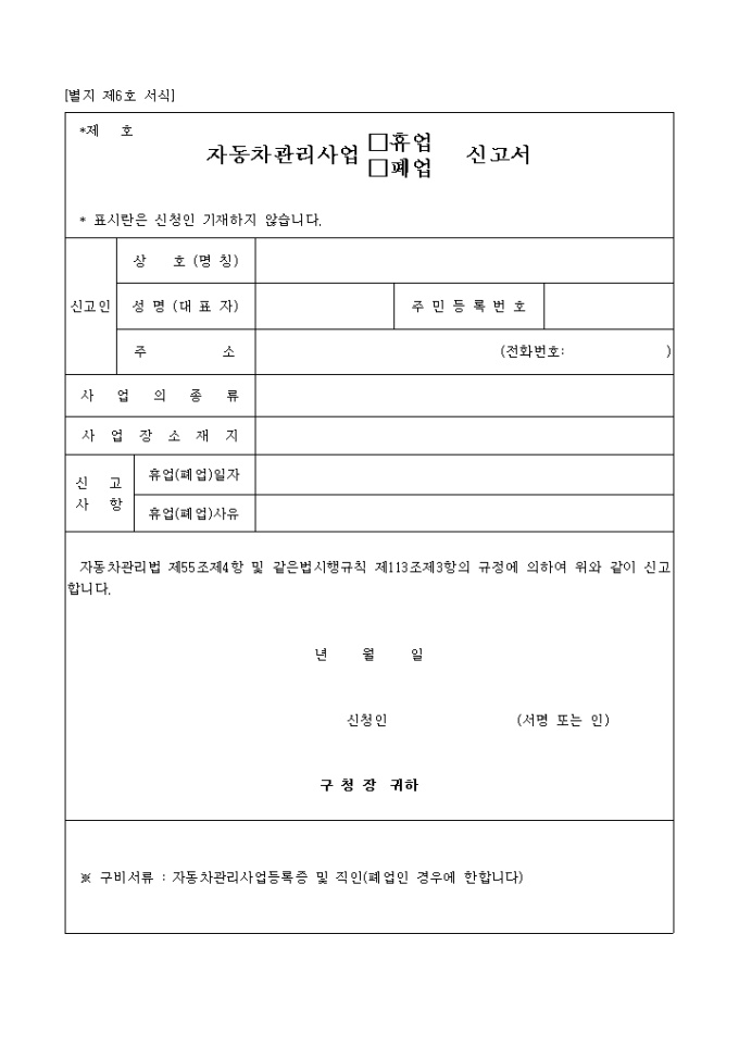 9,000원/월자동차관리법 제55조제4항 및 같은법시행규칙 제113조제3항의 규정에 의하여 위와 같이 신고할 때 사용하는 "자동차 관리사업 (휴업,폐업,재개업)신고서" 양식입니다.