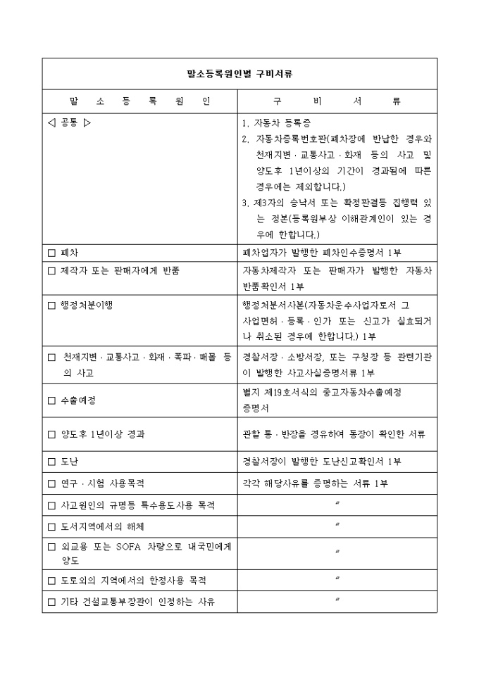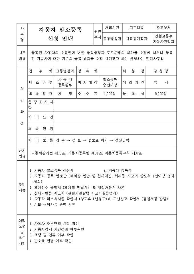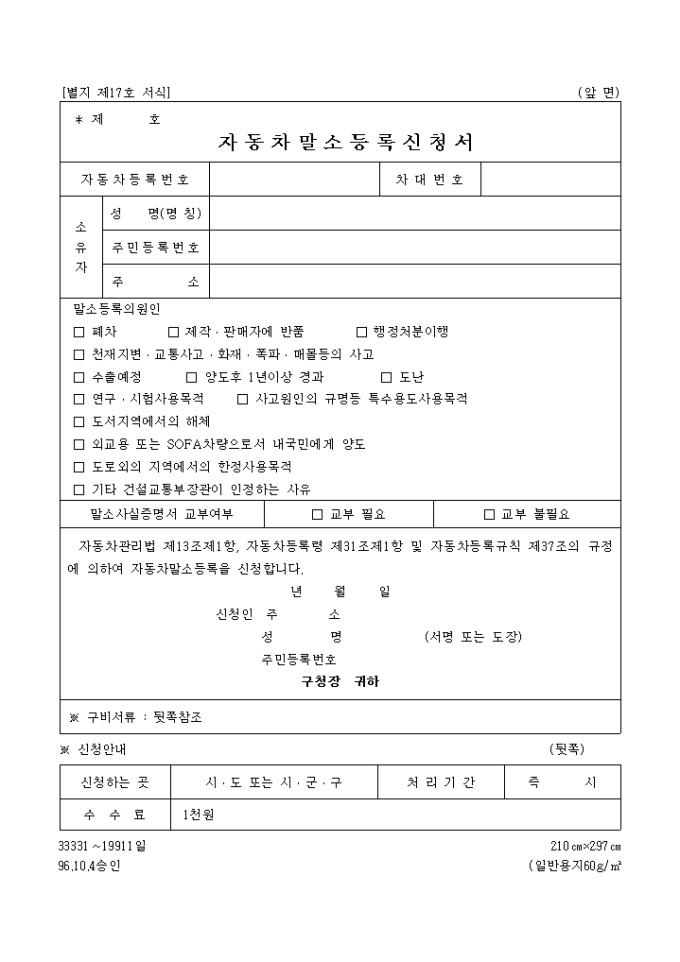 9,000원/월자동차관리법 제13조제1항, 자동차등록령 제31조제1항 및 자동차등록규칙 제37조의 규정에 의하여 자동차말소등록을 신청할 때 사용하는 자동차 말소 등록신청서 양식입니다.