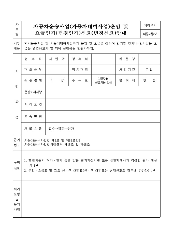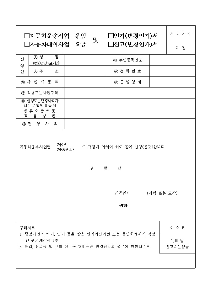 9,000원/월자동차운수사업법 (제8조 제55조의 5)의 규정에 의하여 위와 같이 신청(신고)할 때 사용하는 "자동차 운송 사업운임(대여사업요금) 및 인가,신고(변경)서" 양식입니다.