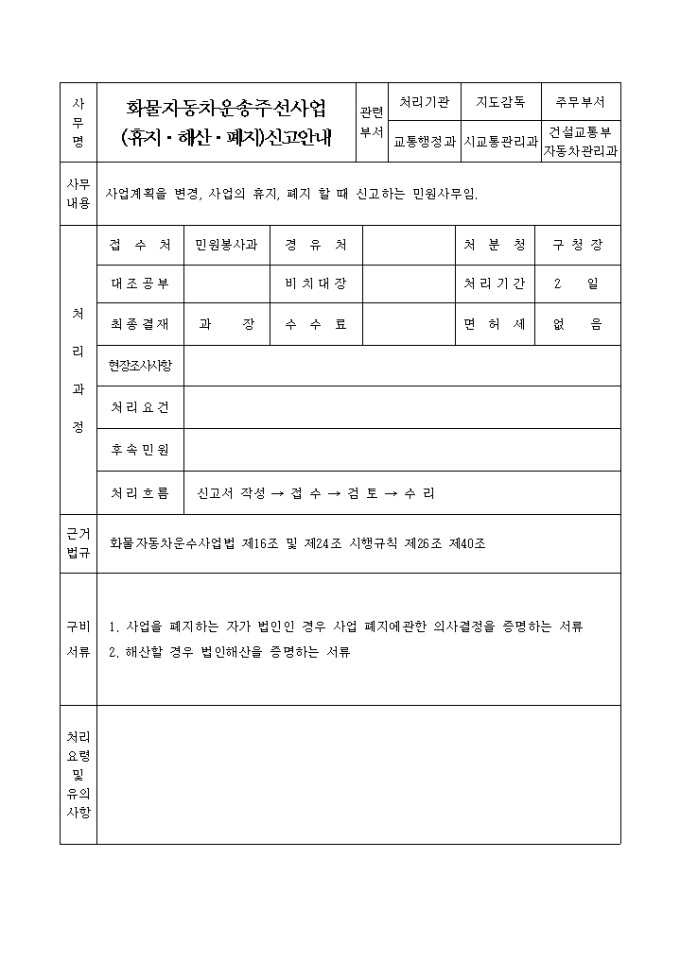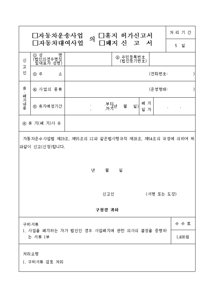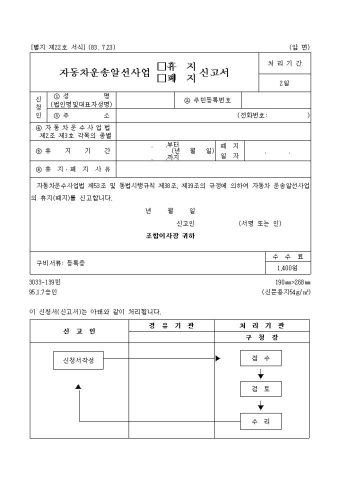 9,000원/월자동차운수사업법 제53조 및 동법시행규칙 제38조, 제39조의 규정에 의하여 자동차 운송알선사업의 휴지(폐지)를 신고할 때 사용하는 "자동차 운송알선 사업휴지,폐지 신고서" 양식입니다.