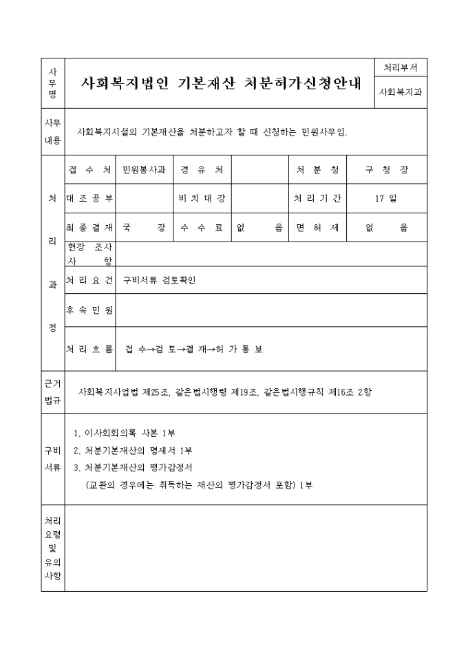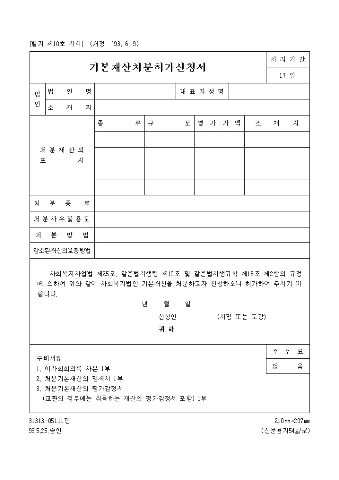 9,000원/월사회복지사업법 제25조, 같은법시행령 제19조 및 같은법시행규칙 제16조 제2항의 규정에 의하여 위와 같이 사회복지법인 기본재산을 처분하고자 신청하오니 허가를 득하고자 할 때 사용하는 "기본재산 처분 허가신청서" 양식입니다.