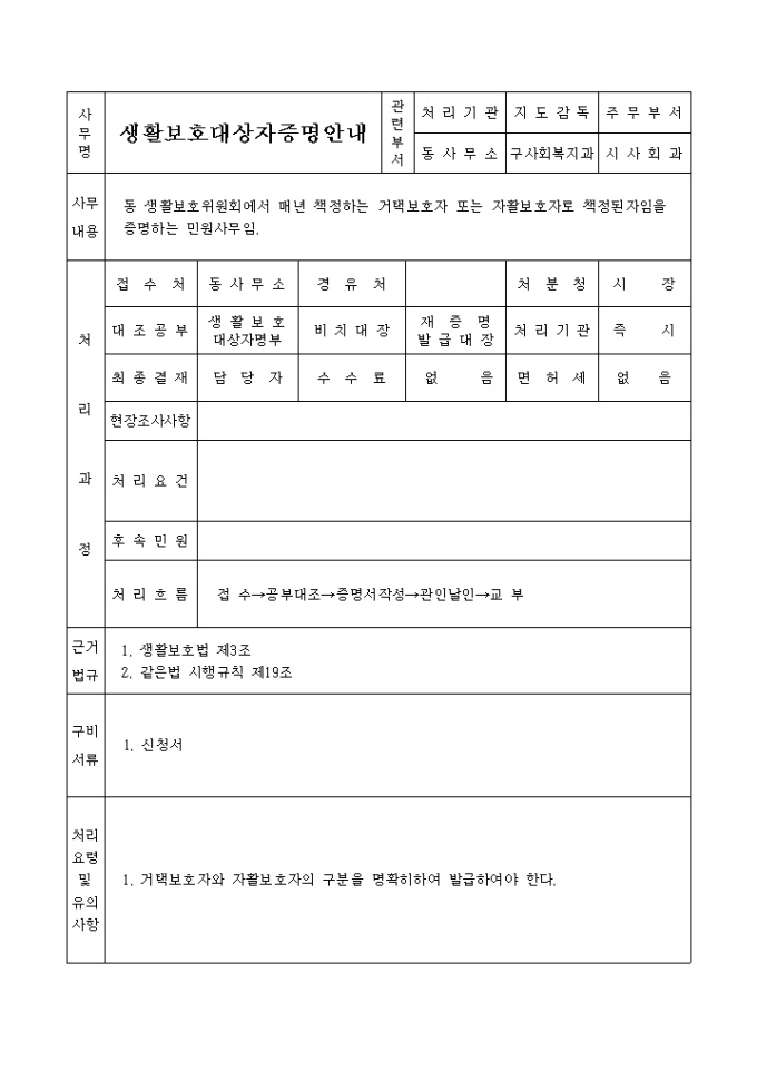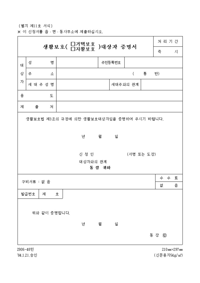 9,000원/월생활보호법 제3조의 규정에 의한 생활보호대상자임을 증명할 때 사용하는 "생활보호 거택, 자활 보호대상자 증명서" 양식입니다.