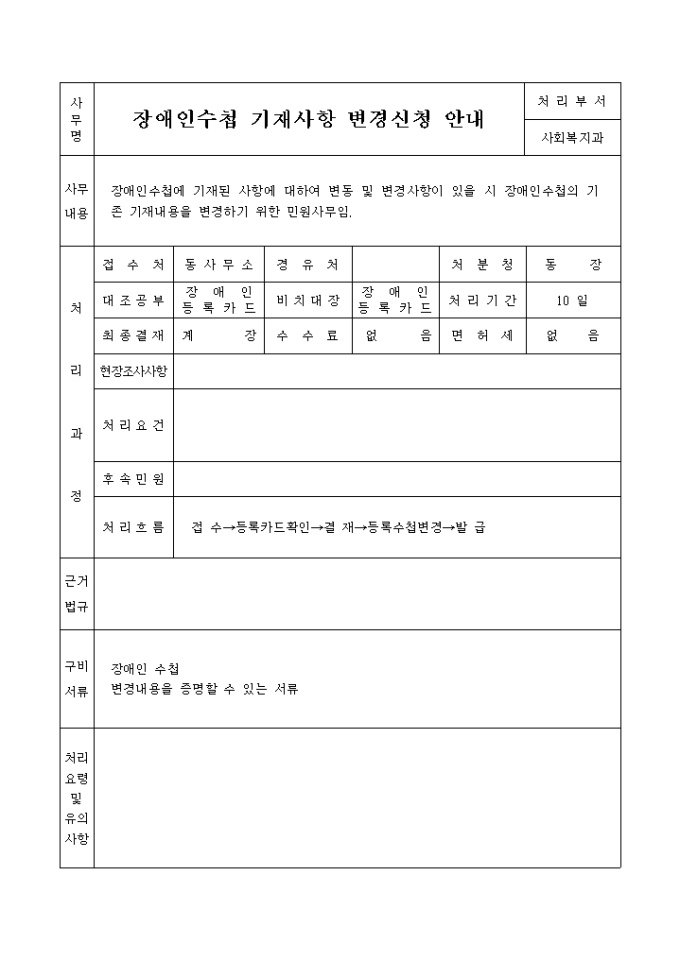 9,000원/월장애인수첩에 기재된 사항에 대하여 변동 및 변경사항이 있을 시 장애인수첩의 기존 기재내용을 변경할 때 사용하는 "장애인 수첩기재사항 변경신청서" 양식입니다.
