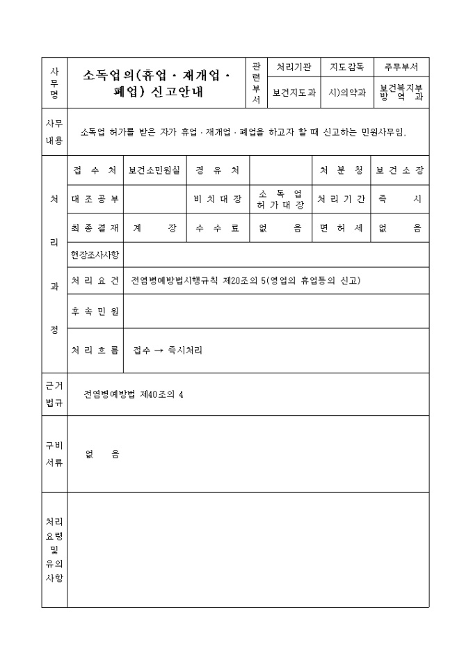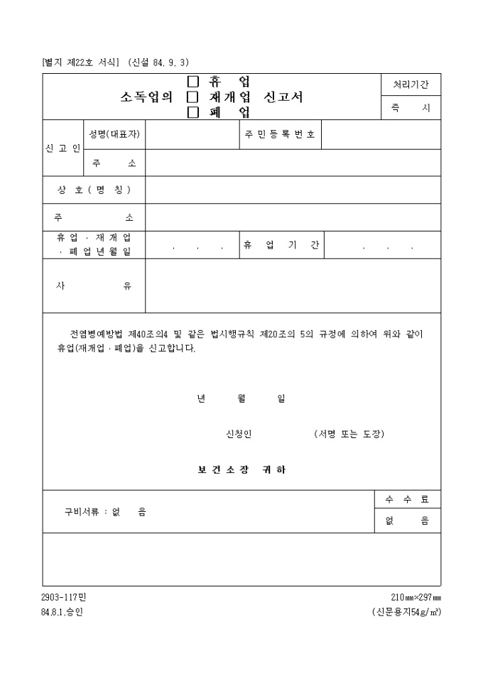 소독업의휴업, 재개업, 폐업신고서
