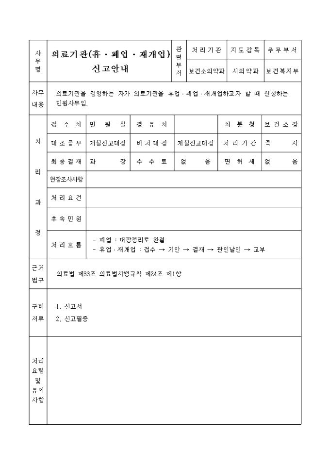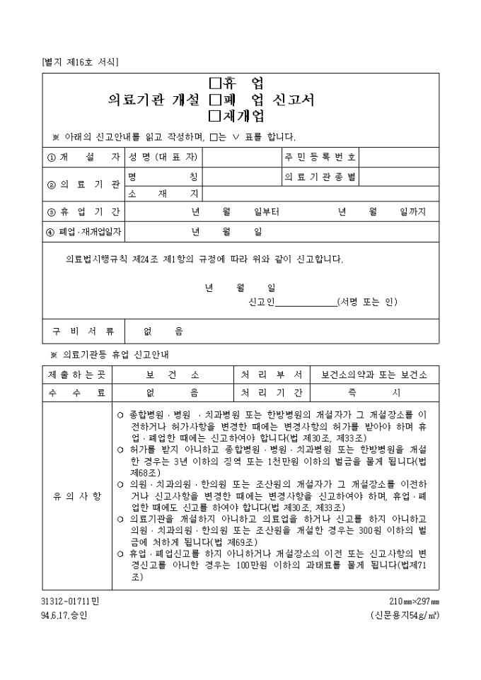 9,000원/월의료기관을 경영하는 자가 의료기관을 휴업․폐업․재개업하고자 할 때 신청할 때 사용하는 "의료기관 개설 휴업,폐업,재개업신고서" 양식입니다.