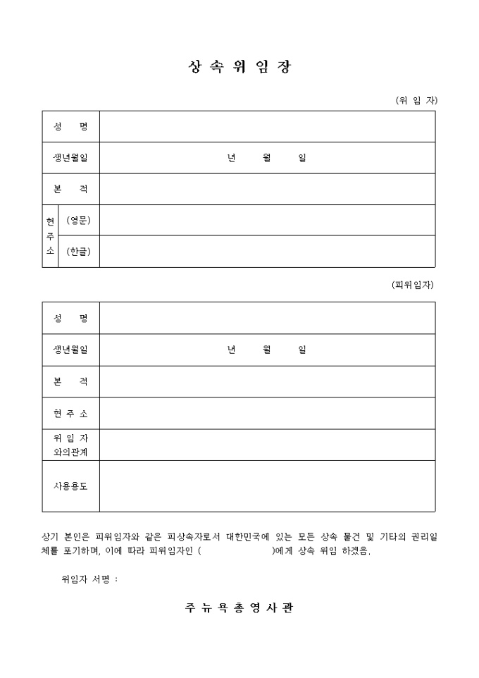 피위임자와 같은 피상속자로서 대한 민국에 있는 모든 상속 물건 및 기타의 권리일체를 포기하며, 이에 따라 피위임자인에게 상속 위임할 때 사용하는 양식입니다.