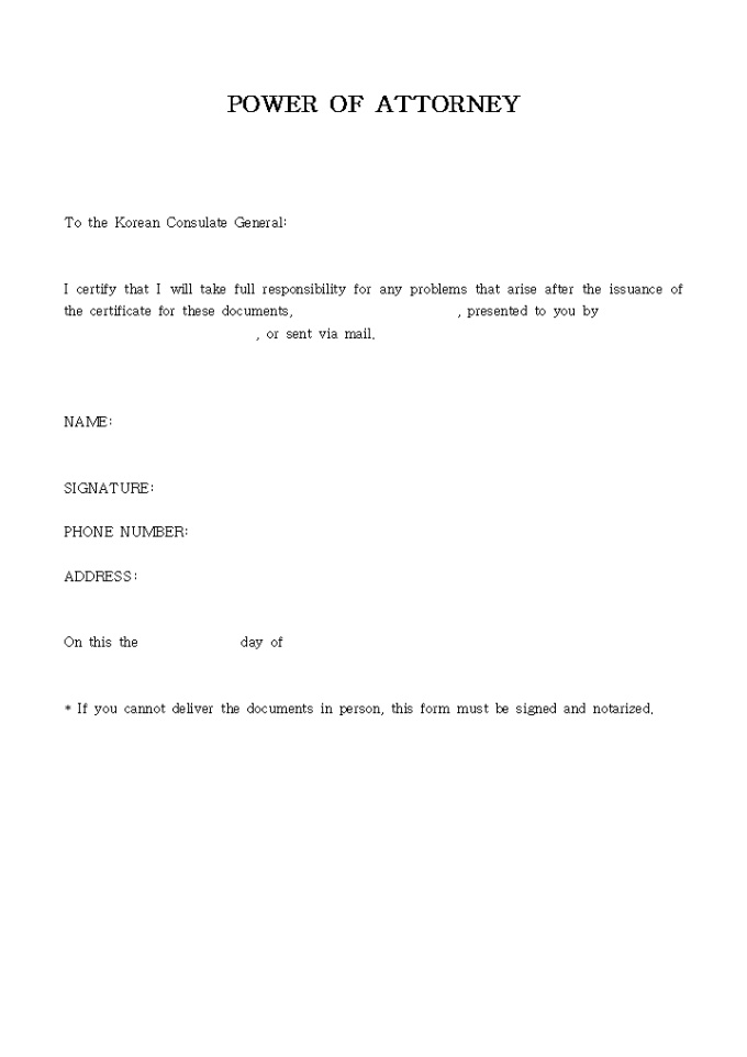 영문으로 작성된 영사확인용 위임권 양식입니다.