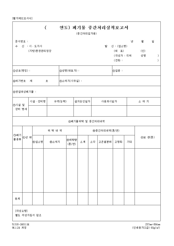 폐기물관리법32서식(96.01.24)-폐기물중간처리실적보고서(중간처리업자용) 입니다.