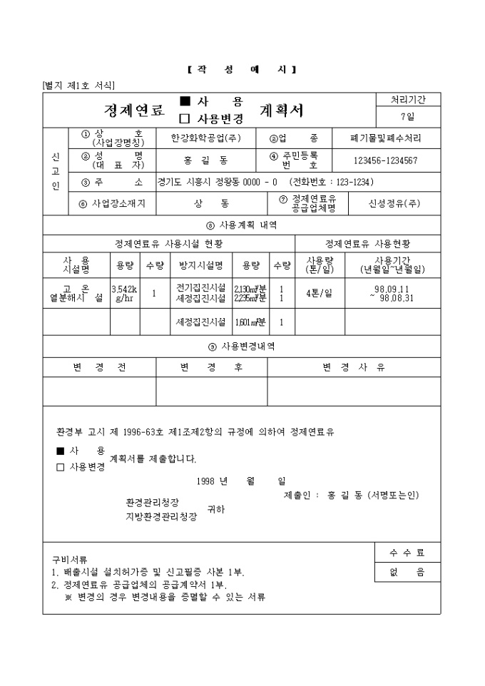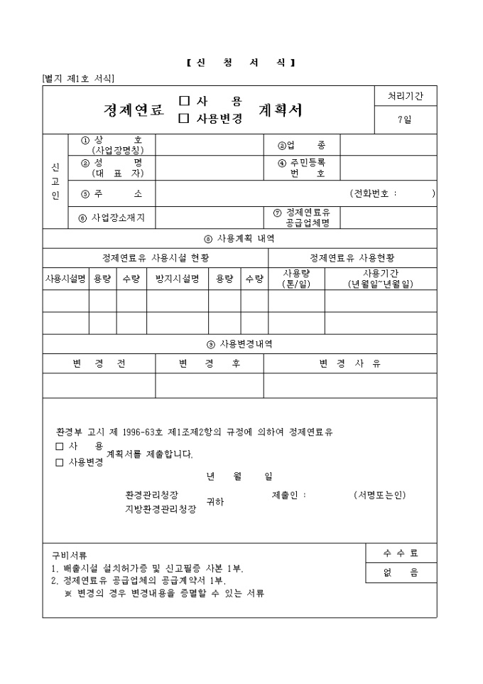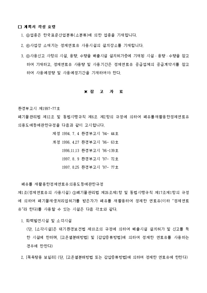 환경부 고시 제 1996-63호 제1조제2항의 규정에 의하여 정제연료유 (□ 사 용/□ 사용변경)계획서를 제출하실때 사용하는 양식입니다.