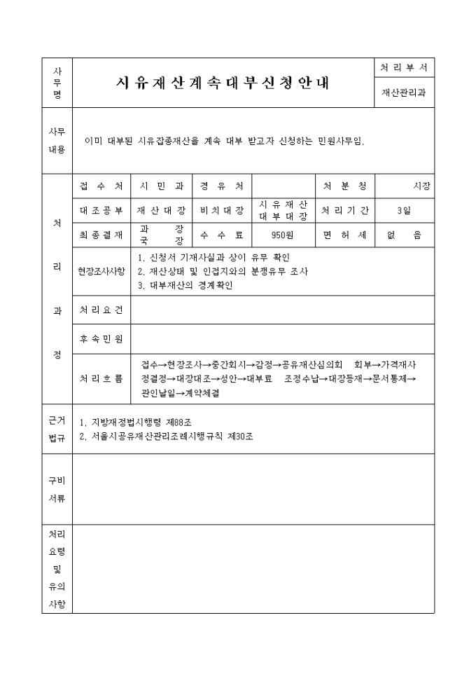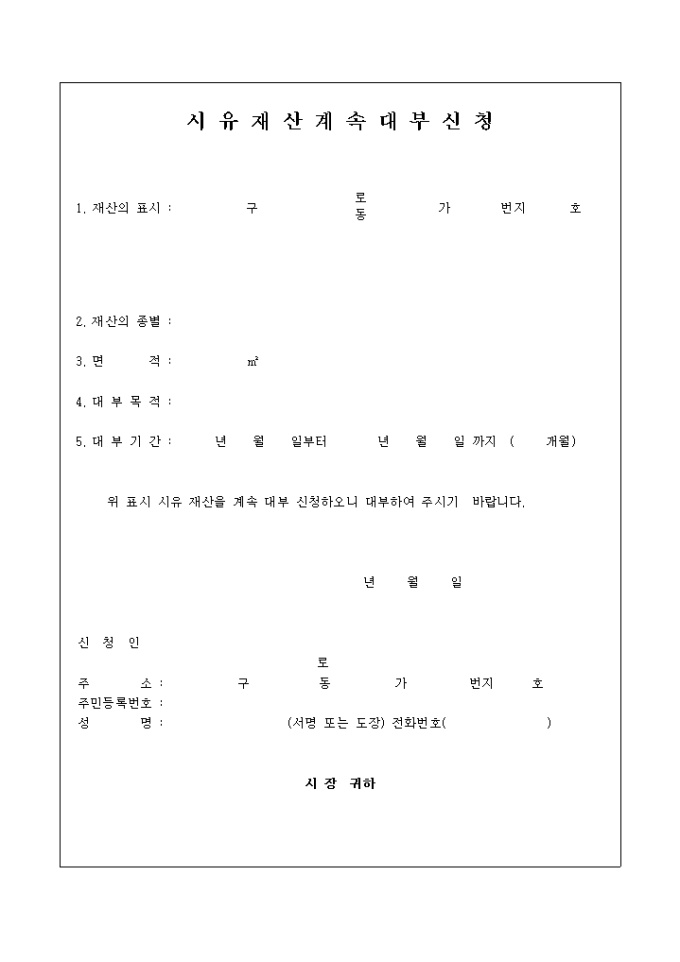 9,000원/월이미 대부된 시유잡종재산을 계속 대부 받고자 신청할 때 사용하는 시유재산 계속대부 신청서 양식입니다.