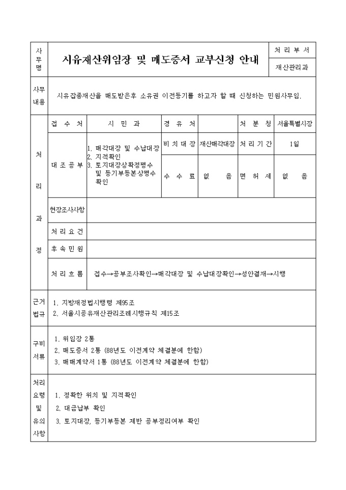 9,000원/월시유잡종재산을 매도받은후 소유권 이전등기를 하고자 할 때 신청할 때 사용하는 '시유재산 위임장 및 매도증서 교부신청' 양식입니다.