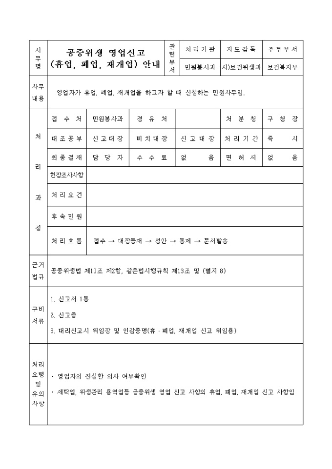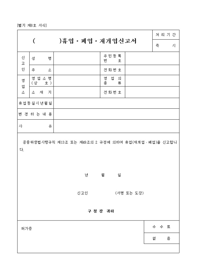 9,000원/월공중위생법시행규칙 제13조 또는 제49조의 2 규정에 의하여 휴업(재개업․폐업)을 신고할 때 사용하는 "( )휴업,폐업,재개업 신고서(공중위생)" 양식입니다.