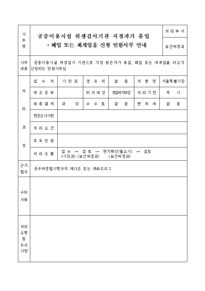 9,000원/월공중이용시설 위생검사 기관으로 지정 받은자가 휴업, 폐업 또는 재개업을 하고자 신청하고자 할 때 사용하는 "공중이용시설 위생검사 기관 휴업,폐업,재개업신고서" 양식입니다.