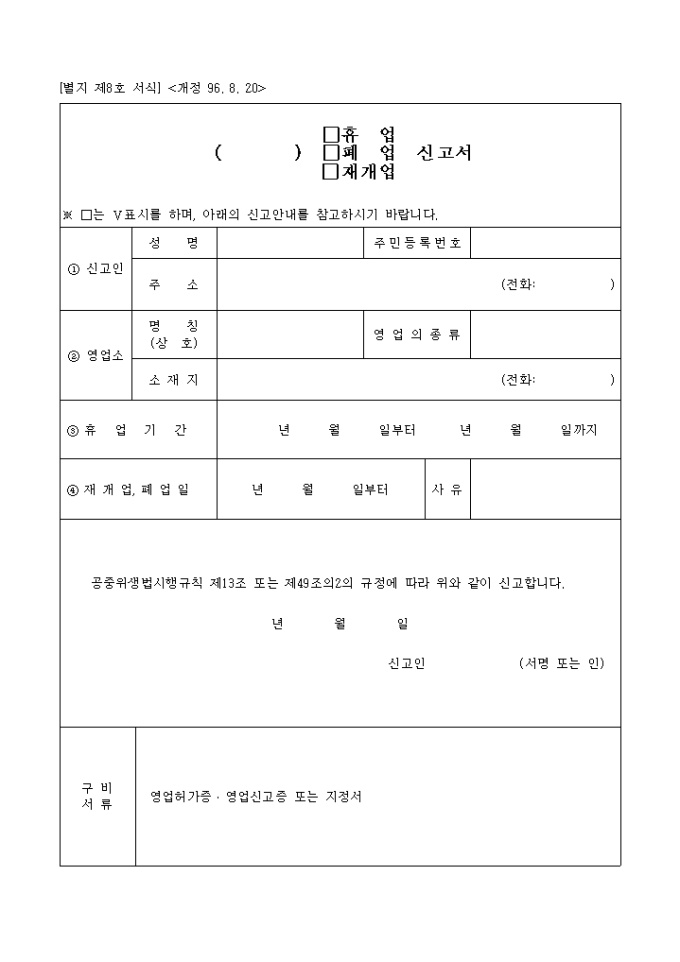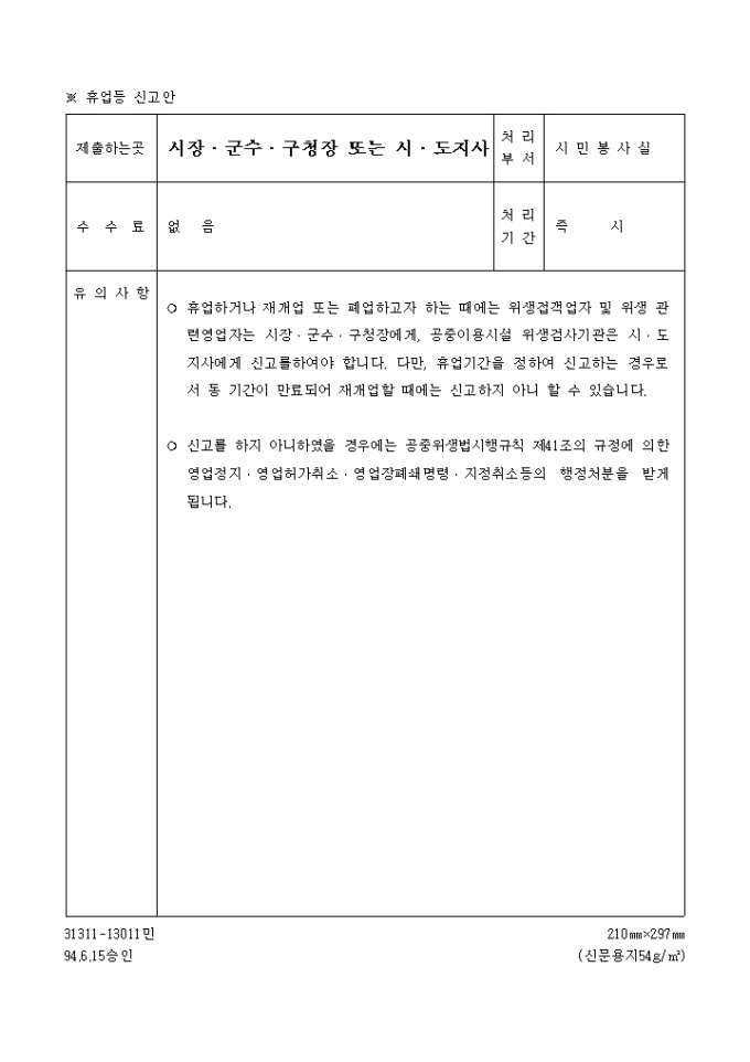 9,000원/월공중위생법시행규칙 제13조 또는 제49조의2의 규정에 따라 위와 같이 신고할 때 사용하는 "기타 위생용품 제조업 재개업.휴업,폐업신고서" 양식입니다.