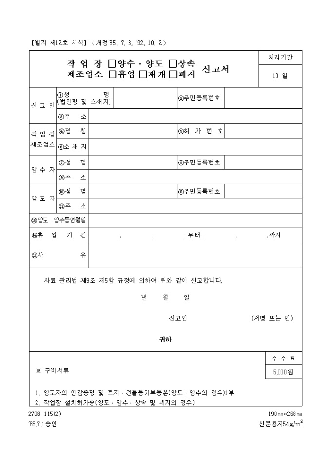 9,000원/월사료 관리법 제9조 제5항 규정에 의하여 위와 같이 신고하고자 할 때 사용하는 "축산물 작업장 제조업소 양수,양도,상속,휴업,재개,폐지신고서" 양식입니다.
