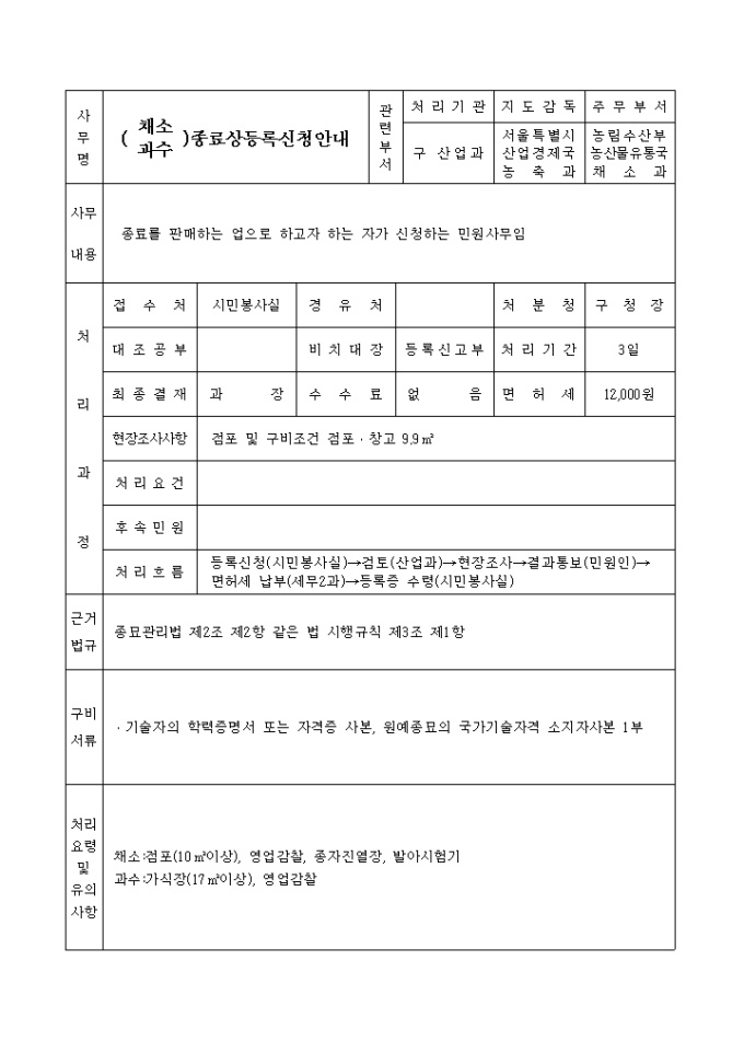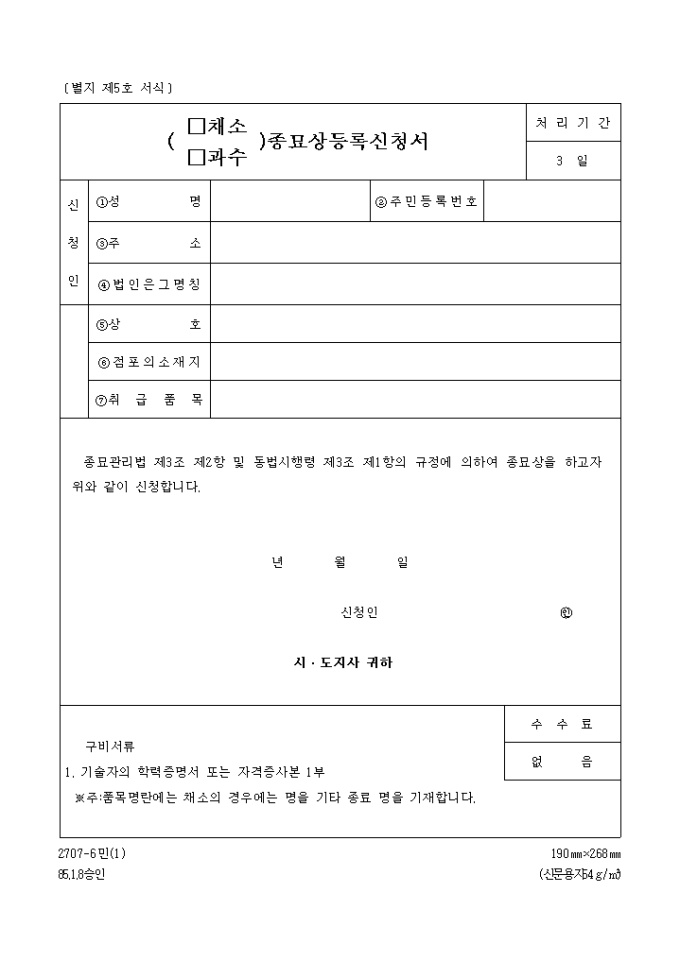 9,000원/월종묘관리법 제3조 제2항 및 동법시행령 제3조 제1항의 규정에 의하여 종묘상을 하고자 위와 같이 신청할 때 사용하는 "(채소,과수)종묘상등록신청서" 양식입니다.