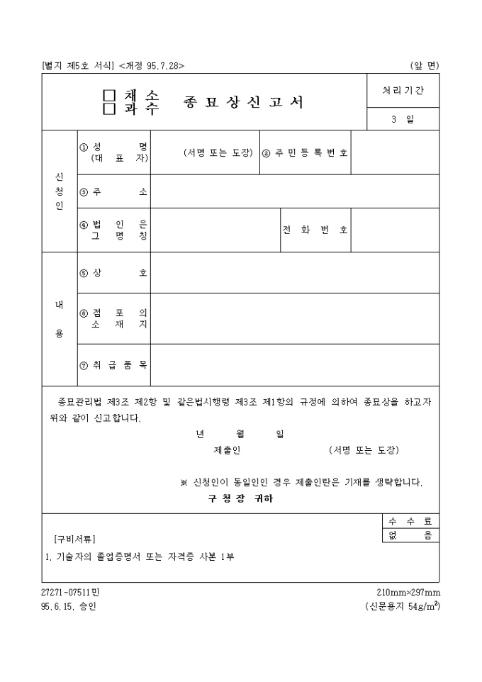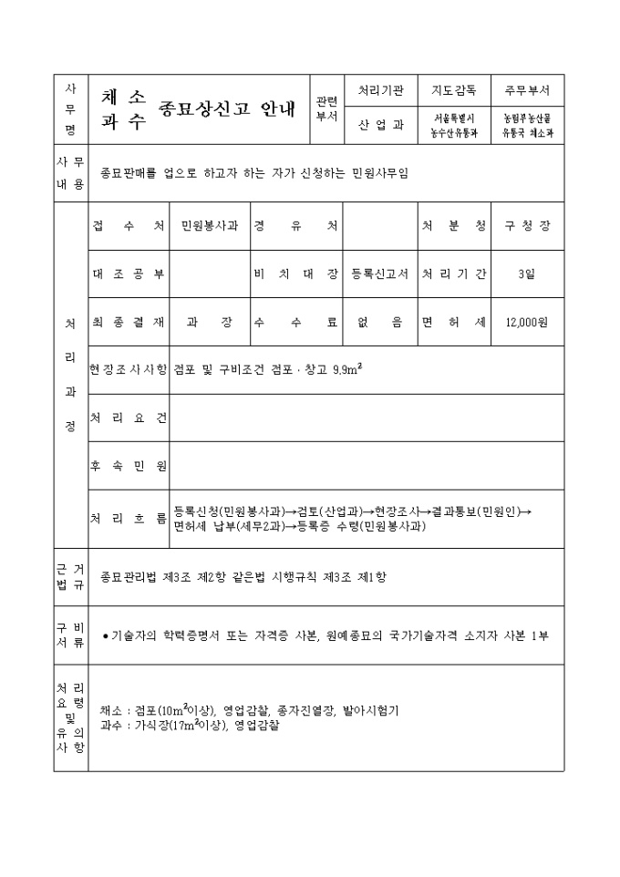 9,000원/월종묘관리법 제3조 제2항 및 같은법시행령 제3조 제1항의 규정에 의하여 종묘상을 하고자 위와 같이 신고할 때 사용하는 "(채소,과수)종묘상 신고서" 양식입니다.