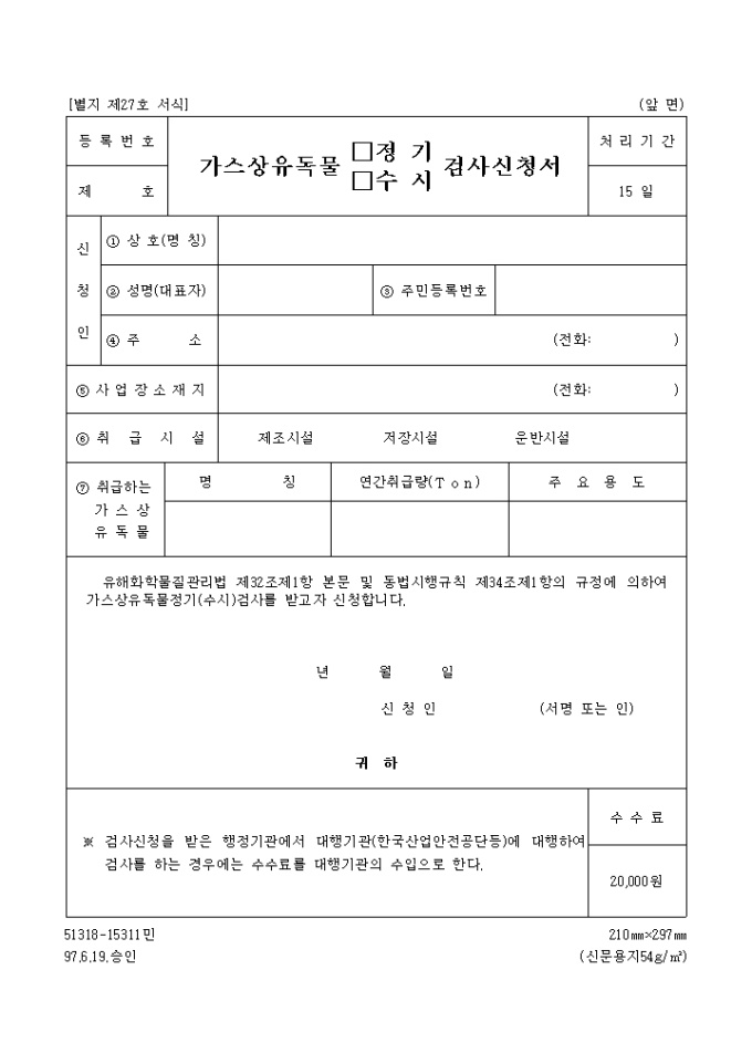 9,000원/월유해화학물질관리법 제32조제1항 본문 및 동법시행규칙 제34조제1항의 규정에 의하여 가스상유독물정기(수시)검사를 받고자 신청할 때 사용하는 "가스상 유독물 정기,수시검사 신청서" 양식입니다.