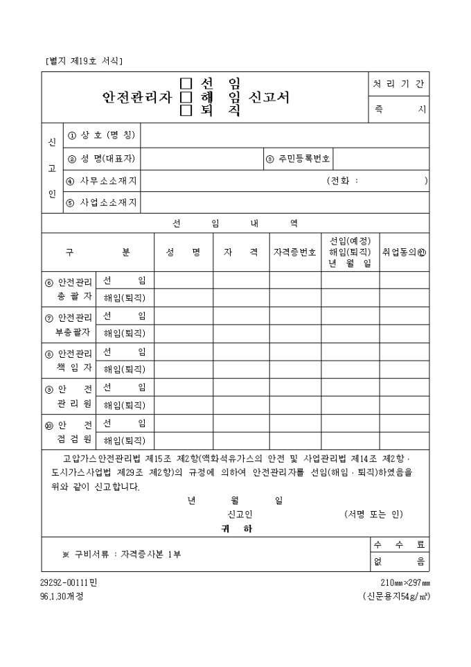 가스안전관리자선임, 해임, 퇴직신고서-제319