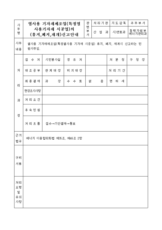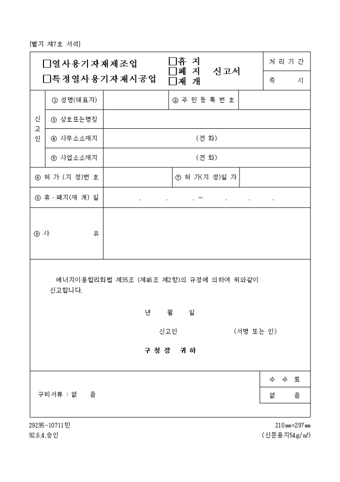 9,000원/월에너지이용합리화법 제35조 (제46조 제2항)의 규정에 의하여 위와같이 신고할 때 사용하는 "열사용 기자재 제조업(특정)휴지,폐지,재개신고서" 양식입니다.