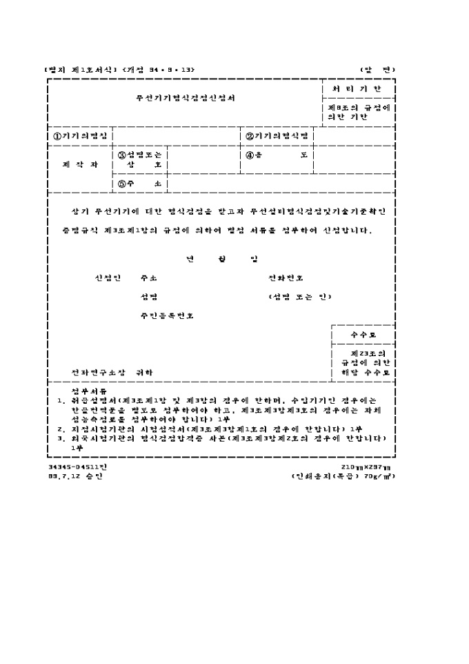 무선기기 형식 검정신청서