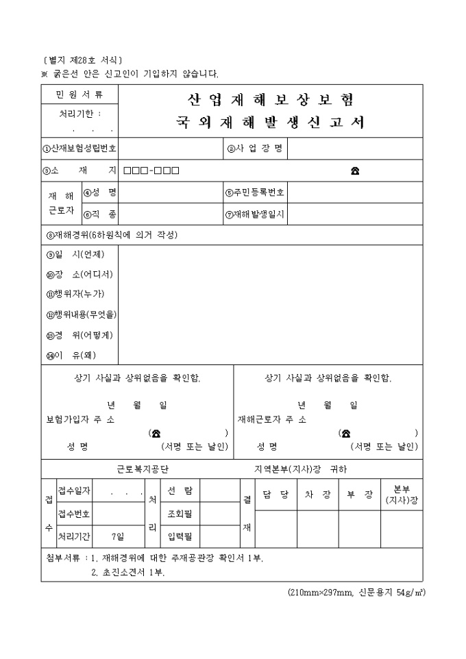 9,000원/월[별지 제28호 서식] 산업재해보상보험국외재해발생신고서 양식입니다. 첨부서류 1. 재해경위에 대한 주재공관장 확인서 1부. 2. 초진소견서 1부