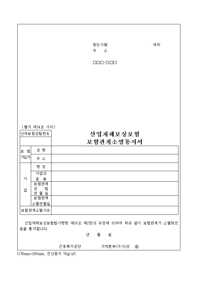 [별지 제14호 서식] 산업재해보상보험보험관계소멸통지서 양식입니다. 산업재해보상보험법시행령 제16조 제2항의 규정에 의하여 위와 같이 보험관계가 소멸되었음을 통지하실때 사용하는 양식입니다.