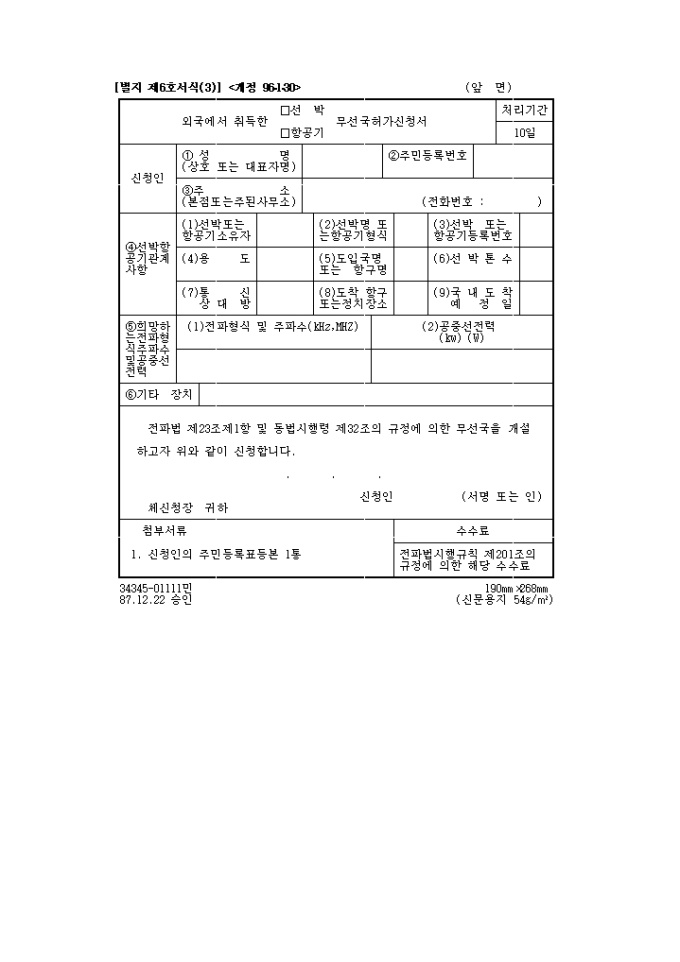 외국에서취득한선박, 항공기무선국허가신청서