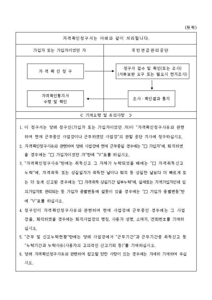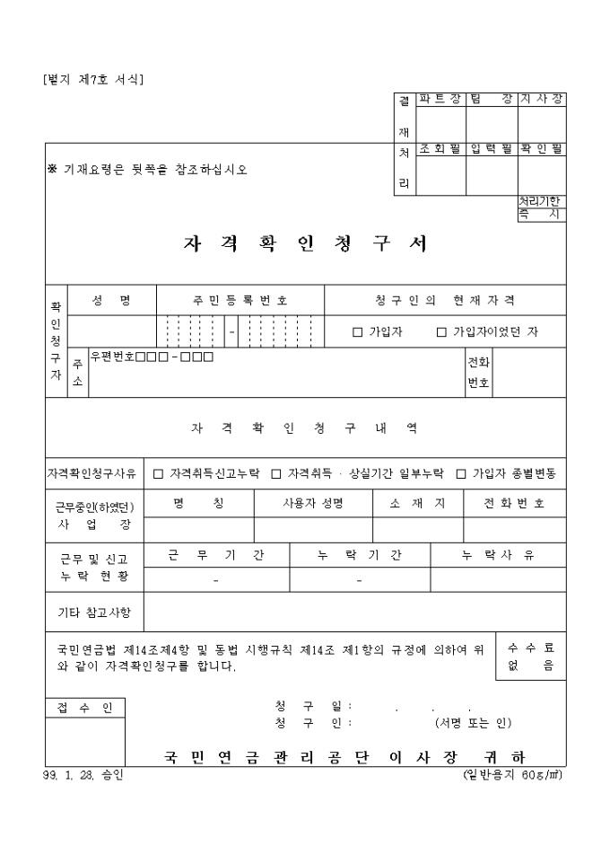 [별지 제7호 서식] 자격확인청구서 양식입니다. 국민연금법 제14조제4항 및 동법 시행규칙 제14조 제1항의 규정에 의하여 위와 같이 자격확인청구 하실때 사용하는 양식입니다.