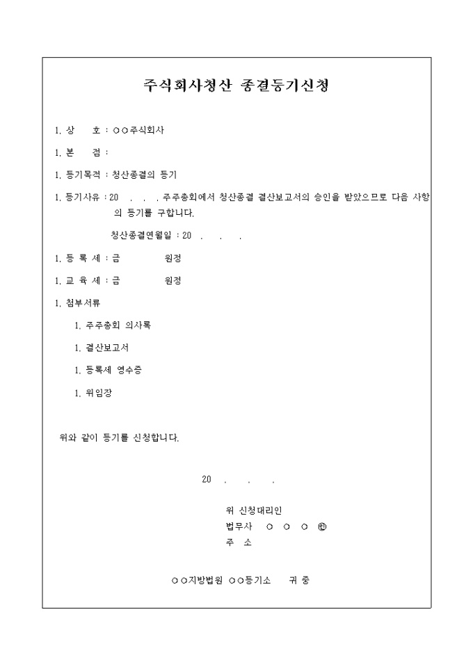 9,000원/월주주총회에서 청산종결 결산보고서의 승인을 받아 그 사항의 등기를 구한다는 내용의 양식입니다.